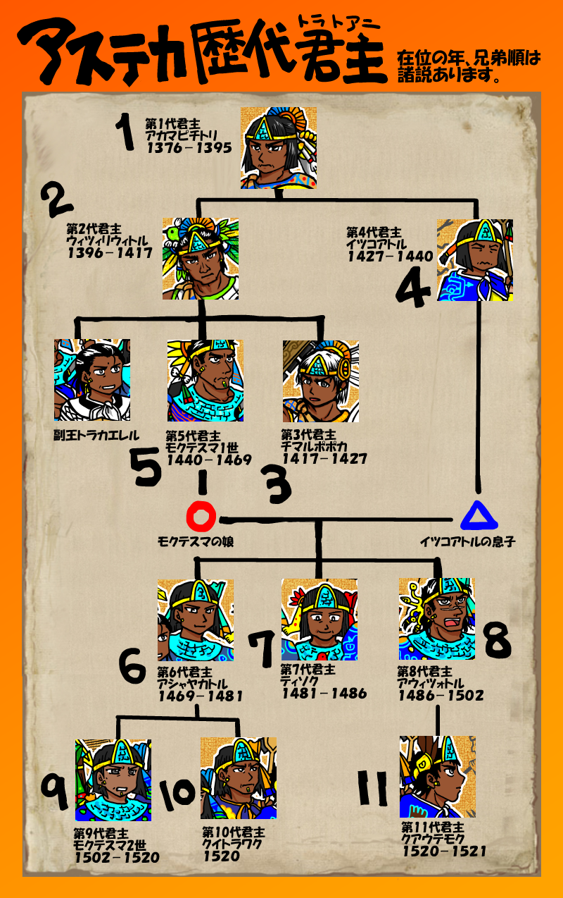 第6代アシャヤカトル、第7代ティソク、第8代アウィツォトルは兄弟です(彼らは、第4代イツコアトルの息子と、第5代モクテスマ一世の娘との間に生まれました)。