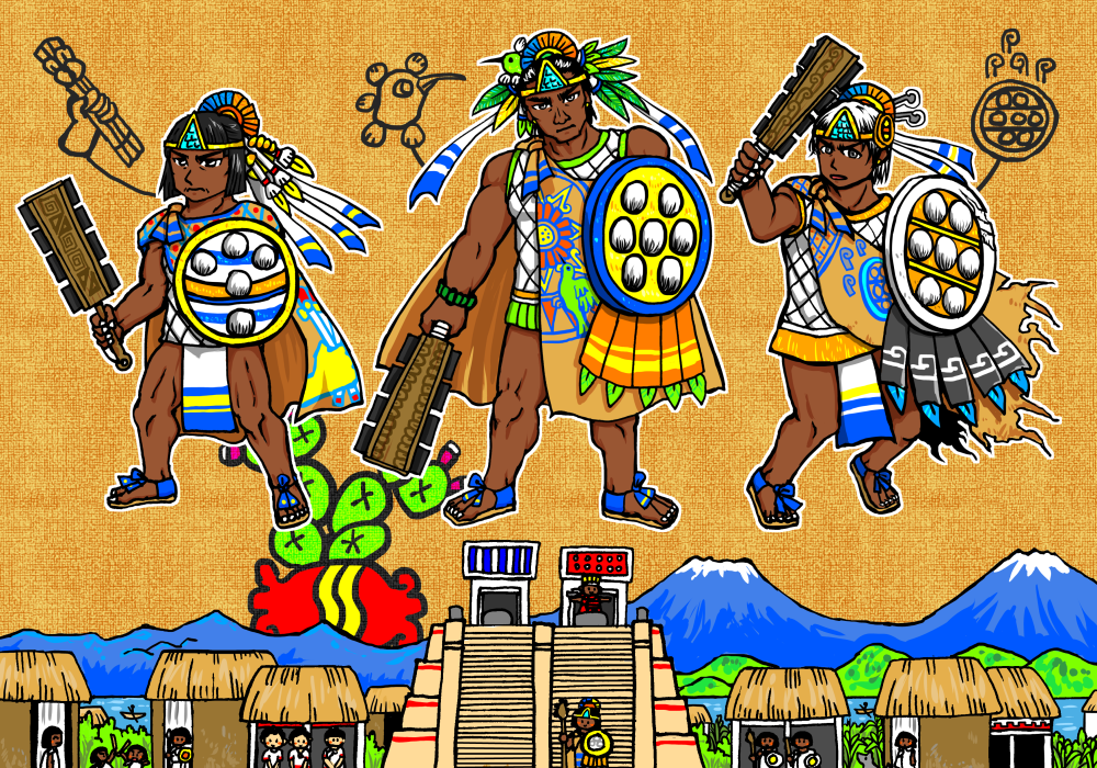 第2代君主ウィツィリウィトルの王子たち。アステカの未来を担う、副王トラカエレル、第5代君主モクテスマ1世、第3代君主チマルポポカは、すべて母親が違う異母兄弟。それを見守るイツコアトルおじさん(ウィツィリウィトルの異母兄弟)。