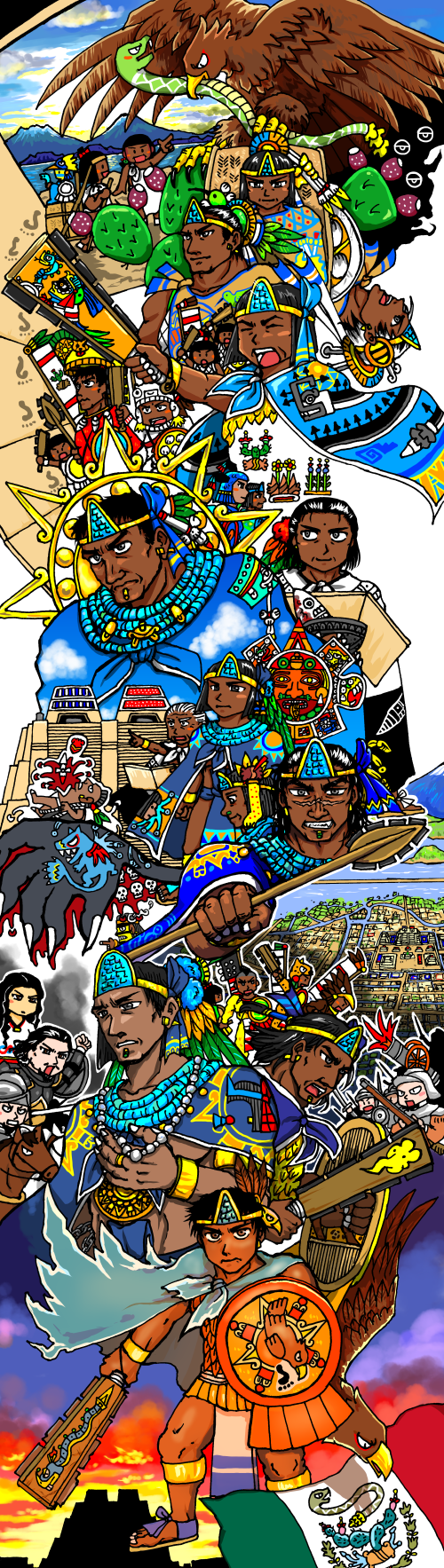途中、女呪術師マリナルショチトルのグループの離反が起き、メキシコ盆地に到着してからも、まわりの部族に新参者扱いされ、さげすまれ、攻撃され、不遇の弱小部族時代が続く。