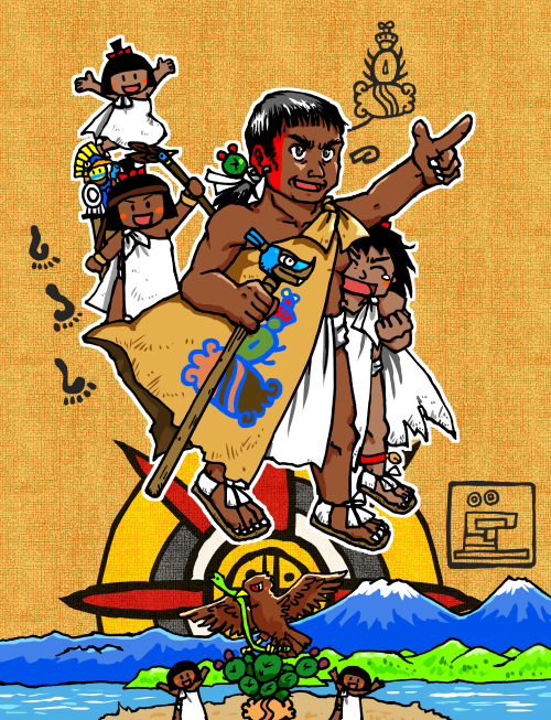 彼らは、テスココ湖の湖の上にある小島に、お告げにあった「サボテンにとまるワシ」の吉兆を見て、自分たちの都市テノチティトランを建設するのであった。