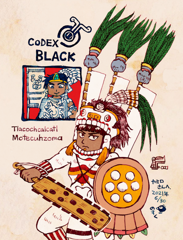 甥である後継者のモテクソマ・ショコヨツィンも登場します。大将軍(トラコチカルカトル)の地位にあり、有能でマジメそうです。 陛下は、よい後継者をお持ちです。メンドーサ絵文書(Codex Mendoza)に載っているトラコチカルカトルの軍装の姿で登場します。